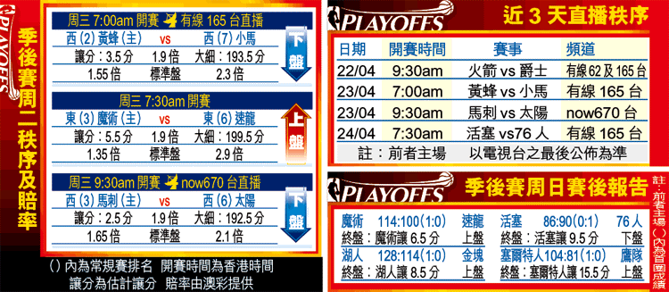 至於被喻為實力與綠軍不相伯仲的活塞,周日卻為輕敵付出沉重代價。雖然第3節中段活塞曾以15分遙遙領先,但其後稍一鬆懈,便被76人在最後一節打出27:16反勝,當中包括罰球一向出眾、今仗只得14分的比立斯,末段在罰球線上4投僅1中及一記輕鬆上籃「炒粉」;就算華萊士貢獻24分、9個籃板及7次封截,亦在落後86:88時補籃失諸交臂,注定活塞返魂乏術。