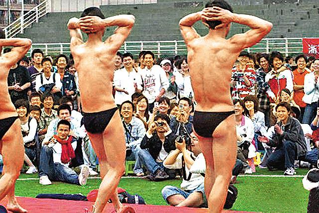 浙江工業大學屏風山校區操場前日上演一場健美騷,9名該校健美協會的同學僅穿內褲,向同學們展示他們經過1年多苦練的健美體形(圖),目的想推動更多人注重鍛煉身體。健美騷吸引了許多同學圍觀。不過,有網民則挑剔9名健美男士肌肉不夠發達,「全是排骨!」有人更認為他們皮膚太白,揶揄他們是「一群白斬雞」。 http://news.163.com/08/0421/09/4A1STSEO00011229.html