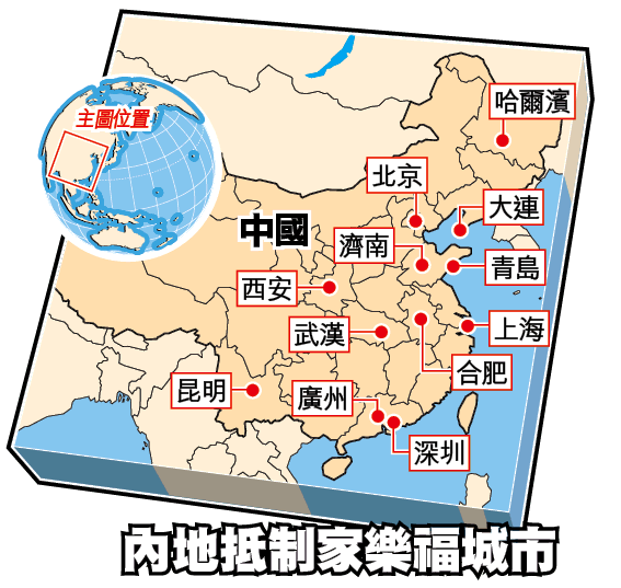不過,內地民族情緒如野火蔓延,昨日繼續有多個城市爆發反法和抵制法國貨示威。新華社報道,昨日示威城市包括陝西西安、山東濟南和青島、東北哈爾濱和大連、西南昆明和湖北武漢等,加上前日的示威,兩天合計12城市示威。示威者高舉五星紅旗、高喊「抵制家樂福」、「反對藏獨」等口號。