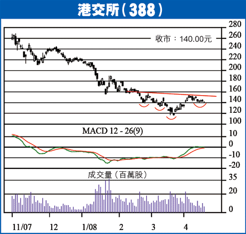 後市看好,港交所(388)係要優先留意嘅股票,由2月開始,港交所走勢亦形成複式頭肩底,低位113元,頸線150元,現時股價在10日線(143.13元)及50日線(142.33元)水平爭持,若能向上拋離並升破頸線,則確認新升浪,短期量度上升目標指向187元。