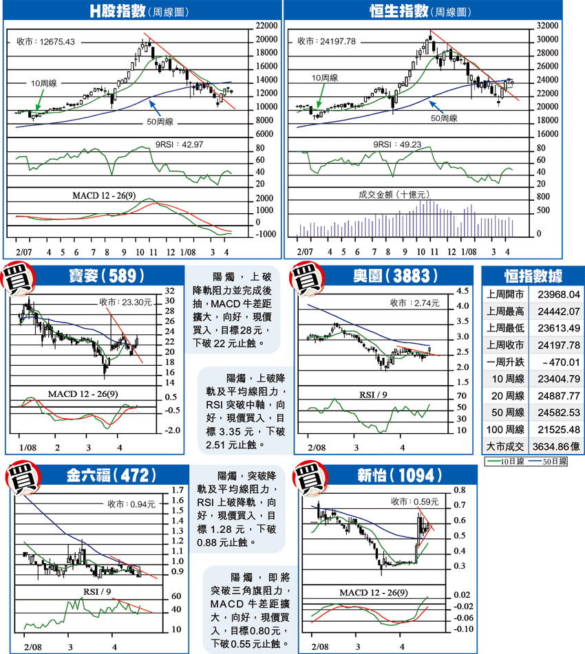 周線圖所見,吊頸的向淡走勢後,再呈待變的陀螺,顯示投資者高位不願追貨,有幸的是低位有一定支持,上周一急挫後逐步收回部份失地,並沒有出現持續急挫的不利走勢,基調上為後抽,預期鞏固過後,再定後向。