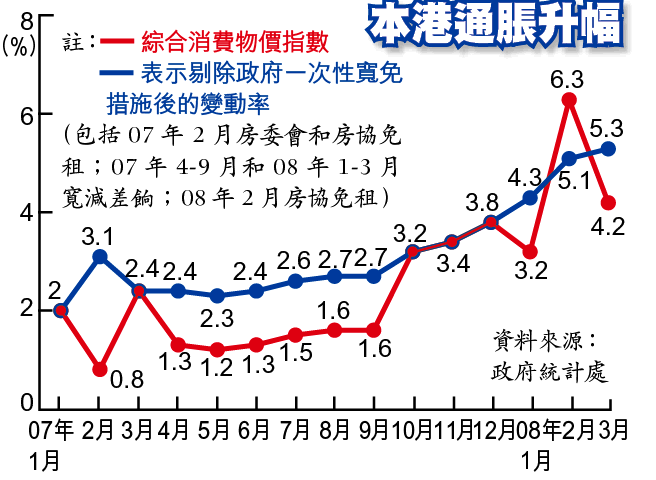 2月份本港通脹率雖然高達6.3%,但在撇除政府去年2月減免公屋租金及差餉等因素後,基本通脹是5.1%,因此3月份本港的基本通脹率,對比2月份高出0.2%。對上一次通脹率高於5.3%是1998年1月,當時消費物價指數按年升幅是5.4%。