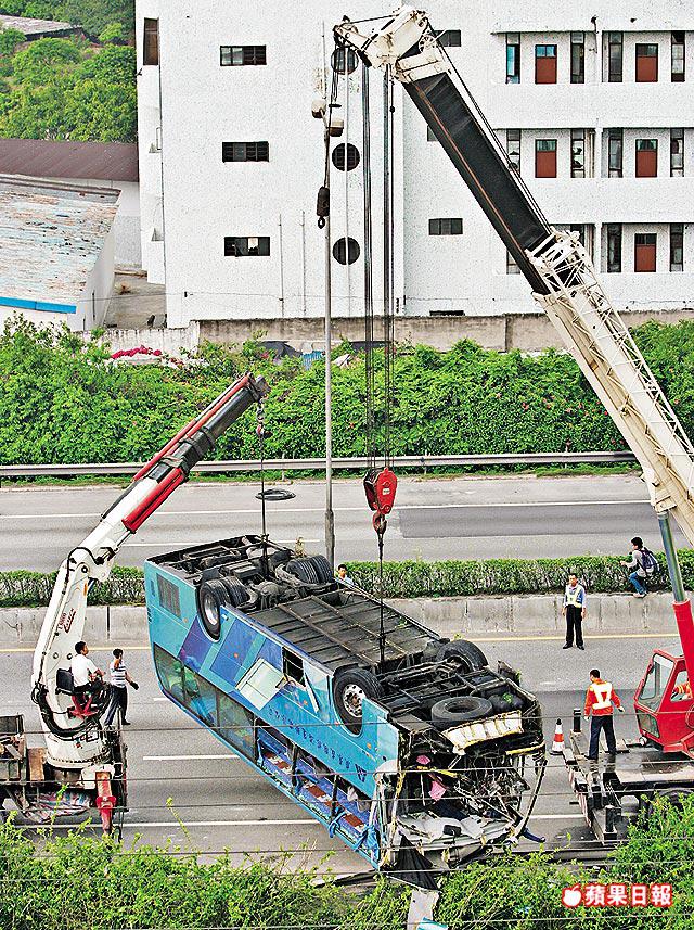 巴士翻側在10米下山坡,大部份乘客被困車廂痛苦呻吟,消防到場需割開巴士車底的行李倉,再從行李倉位置將傷者救出。據悉,大部份傷者是到廣州參加交易會後準備經港回國的外籍商人。