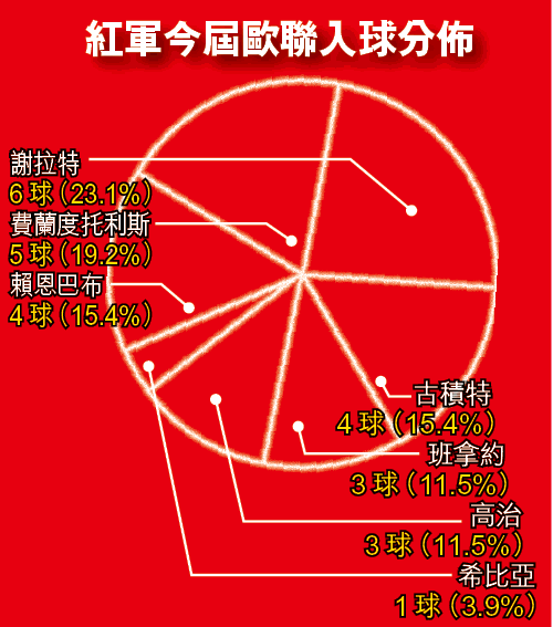 賓尼廸斯不愧是大賽強人,在他領導下,在聯賽並不突出的紅軍戰將,包括古積特、賴恩巴布都在歐聯特醒,難得球隊在晉級過程中入球分佈廣,周身刀張張利(見附表)。謝拉特日前報稱頸傷,惟我才不信這位神奇隊長會錯過今場大戰。