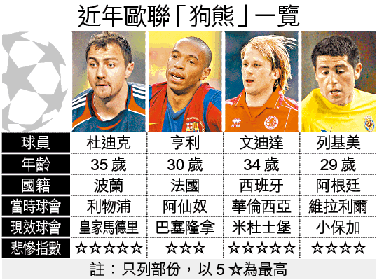 05/06球季,歐聯誕生兩名「爛尾」英雄:亨利與列基美。前者去到決賽才功虧一簣,賽後甚至再被揶揄「細波好型,大波隱形」;後者曾是維拉利爾中興的象徵人物,但球隊於4強遭阿仙奴淘汰,亦是其歐洲路上最後一季讓人緬懷的球季。