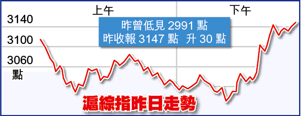 國泰君安分析員指出,昨午滬綜指跌穿三千關後,市場已傳出中央將推出救市第二波,包括減印花稅及油企暴利稅寬減,由於投資者相信三千點為「鐵底市」,遂吸引資金重新入場,而北京銀行昨預告首季多賺1.8倍,一眾銀行股亦紛紛報捷。