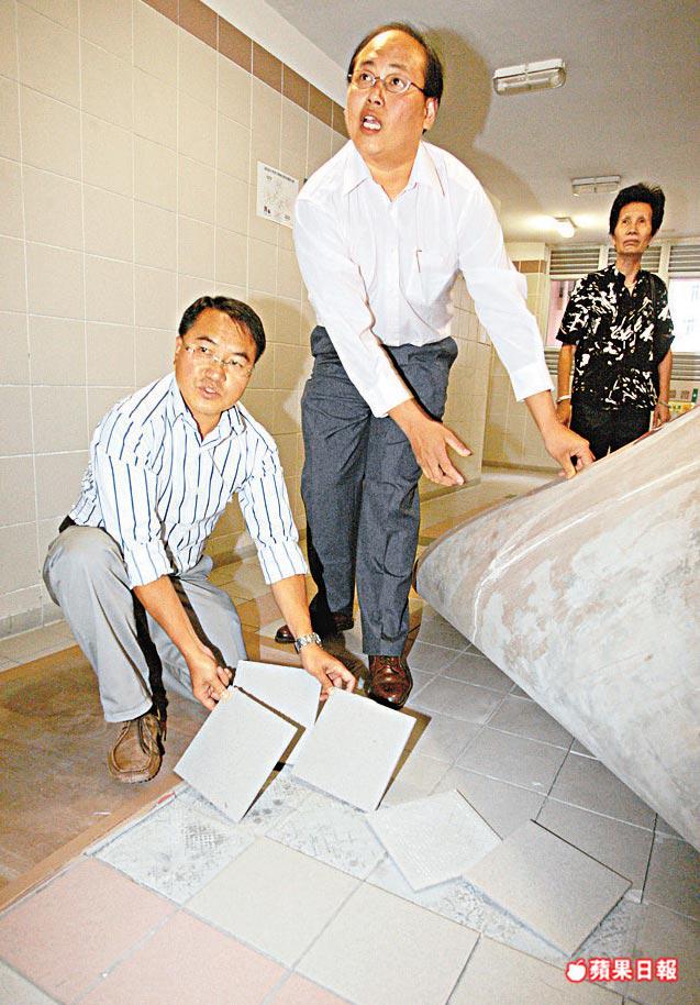 未剝落的瓷磚也未必代表穩陣。張錦柱說,居民敲打多個樓層的瓷磚,都發出「亨亨」聲響,相信是瓷磚未有貼緊石屎牆所致,「好似計時炸彈,唔知幾時會跌落嚟!」他要求房署立即檢查三幢樓宇所有走廊瓷磚,確保居民安全。