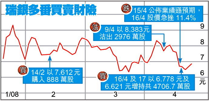 瑞銀於2月14日以平均價7.612元購入888萬股,涉資6765萬元,其後在財險公佈業績前一星期以平均價8.383元沽出2976萬股,套現2.49億元;至本月15日財險公佈遜色的業績,翌日股價曾急挫12.7%,瑞銀遂連續兩日「撈底」,在16及17日以平均價6.778元及6.621元大手吸納4706.7萬股,涉3.16億,以昨財險收報6.93元計,瑞銀不足一周賬面賺988萬。但瑞銀於本月買賣美聯物業(1200)及重慶鋼鐵(1053)則損手。