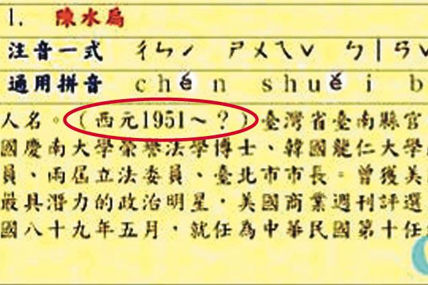 台灣教育部國語辭典網站曾將「三隻小豬」故事當作成語,又把「買春」當成買酒,被人譏笑後,近日再有烏龍事件。該網站在介紹總統陳水扁的條目下,竟以「1951年~?」表述生卒年份(右圖),同樣在李登輝條目下,卒年也是用「?」代替,網友譏諷:「問號代表不知道何時已死,總統不知有何感想?」
