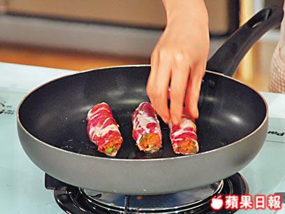 3.燒熱油,下肉卷煎至表面金黃及熟後除去牙籤。