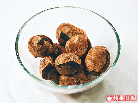 2.栗子去殼,放入沸水中浸10分鐘,用布抹去衣,再加兩杯水烚1小時至腍。