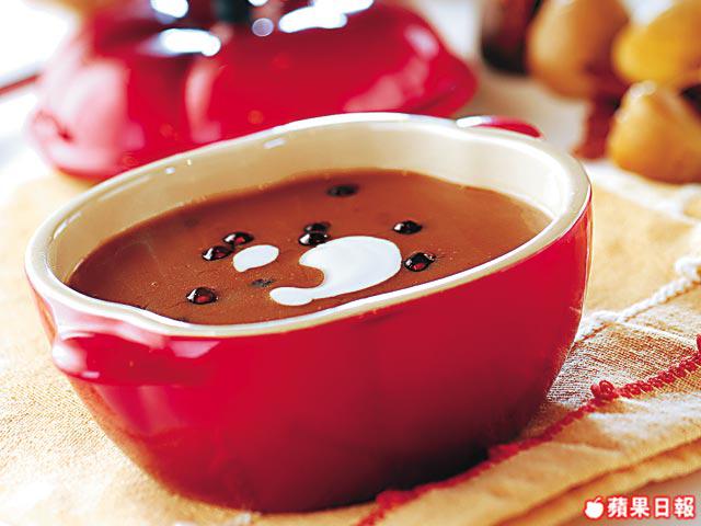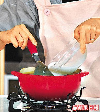 4.另將1杯水加入片糖煮溶,注入栗子漿及粘米粉水至稀稠適中。