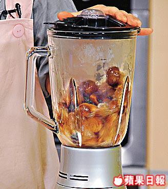 3.將栗子加入2杯栗子水打成漿;粘米粉加入1/2杯水開勻。
