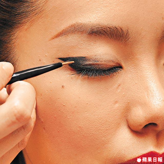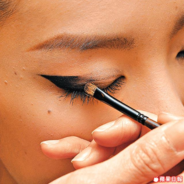 3.粗眼線的角位要保持線條亁淨清楚,可以用遮瑕掃沾上少許遮瑕膏作修飾。再在眉骨和眼中間點上少許白色眼影作Highlight。