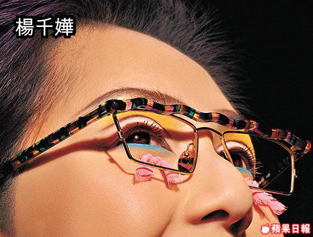 楊千嬅的「復古奶奶」Look是令人不禁莞爾的幽默,靈感竟是江青!相中千嬅塗上鮮艷桃紅唇膏,戴彩斑紋眼鏡,藍黃二色的眼妝跟眼下的粉紅蝴蝶結互相呼應,幽默手法盡現千嬅開心真性情。