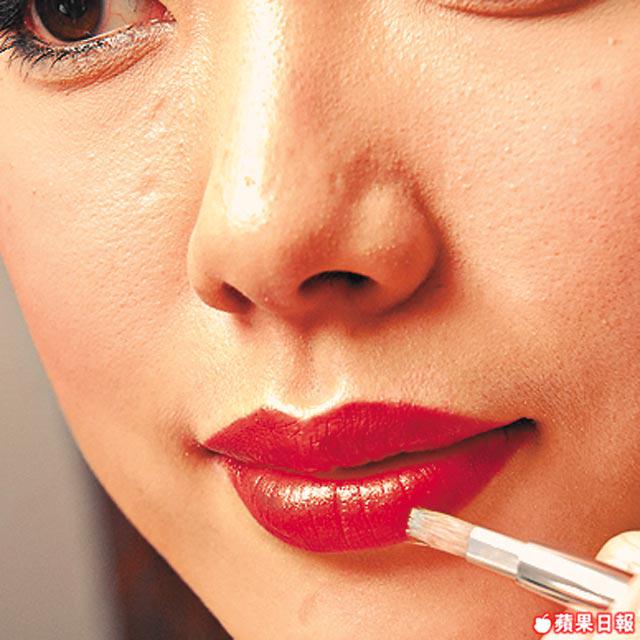 4.先用唇線筆描繪唇形,再用唇掃把桃紅色唇膏填滿嘴唇。