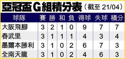 另外,賽前稱傷的飛腳後衞加地亮及前鋒播戶龍二,料都可以披甲,加上前鋒巴爾腳風甚順,近5場入5球,今役不難再次攻破墨爾本大門。