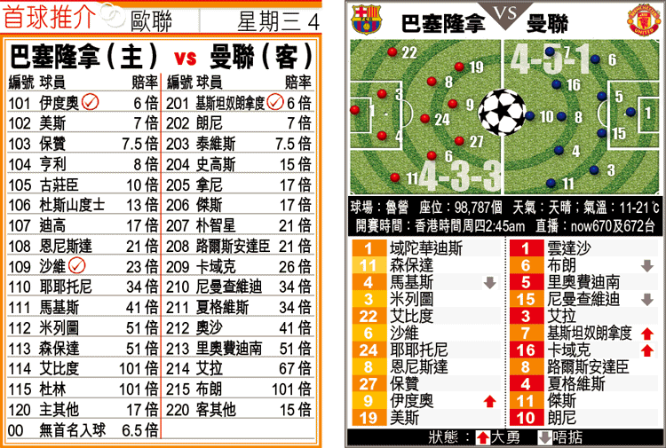 巴塞隆拿在西甲的表現確不值一提,但歐聯卻交足功課,周三在4強首回合迎戰英超的曼聯,有力先拔頭籌,「讓球」平手值捧,並補入球「大」。(球賽編號:星期三4;now670及672台明日2:45am直播)