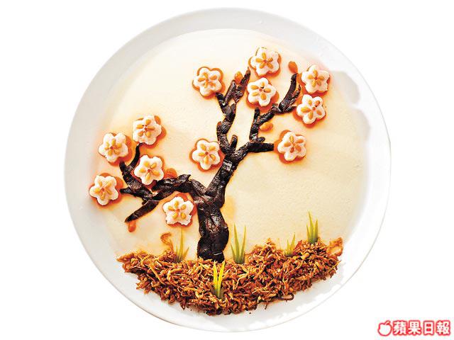 取意「琉璃世界白雪紅梅」,以蝦膠作梅花,頂級冬菇做樹幹,鴿肉絲鋪成土地,蒸蛋白作雪景,畫面優美。