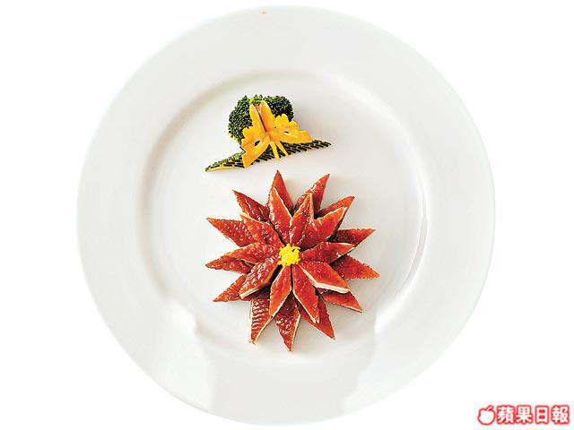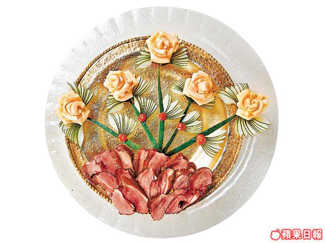 以蛋饅頭做成花形,每朵花約需10分鐘才揑成,極講技巧,鴨胸邊塗上仙人掌汁熏製,味道帶少許甘香。