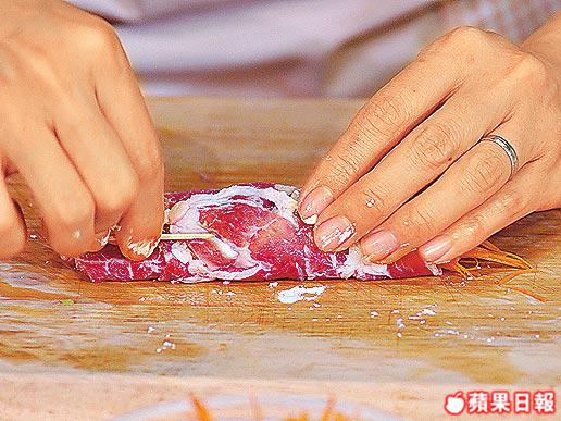 由於豬肉片要包實餡料,但即使用生粉或蛋汁也很難黏實接駁口,最好就是先用牙籤固定,煎好後才除去牙籤便可。