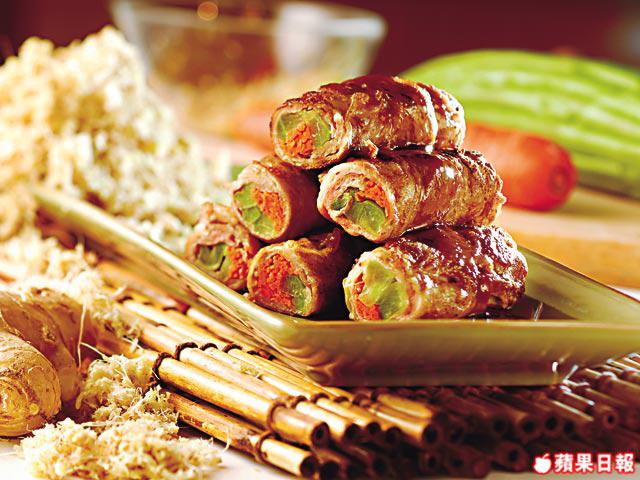 4.燒熱鑊,加入生抽、水、糖及生薑汁煮沸,下生粉水埋芡,淋在肉卷上即可。