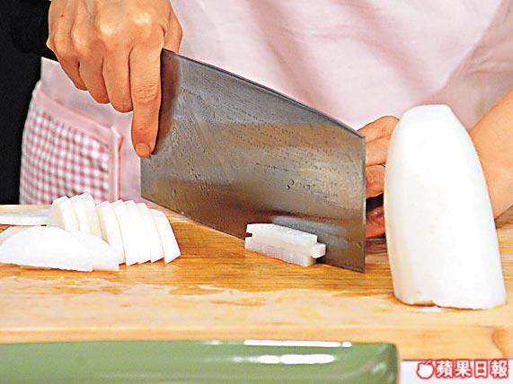 1.水煮沸,下鹽及糖,加白蘿蔔絲冚蓋煮10分鐘,熄火焗透備用。