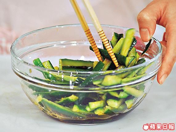 1.小黃瓜切成小段,吸亁水份,下黃瓜調味醃數小時。