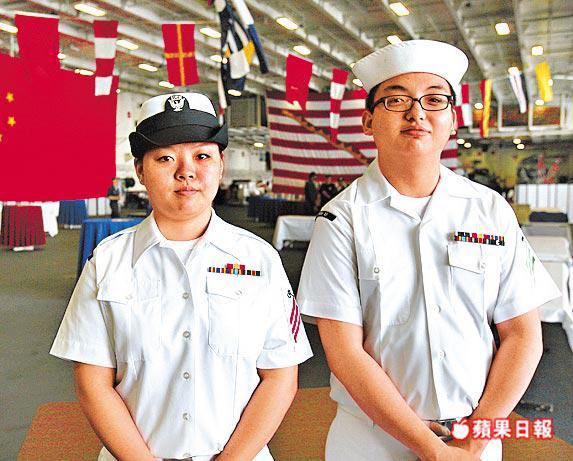 艦上華裔女兵朱瑩原籍上海,移居美國後加入海軍,去年隨艦訪港被拒入境,今次再度訪港,適逢北京奧運聖火即將傳送來港。她不忘自己是中國人,說一定會上岸捧場,為奧運聖火打氣。她指美國近年經濟欠佳,但自己難得訪港,一定會解放錢包,瘋狂購物和看賽馬碰運氣。同樣隨艦訪港的還包括從四川移民美國的華人林昊。