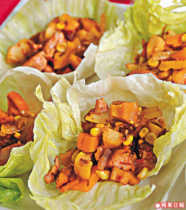 3.起鑊下少許油炒香洋葱粒,然後下紅蘿蔔、粟米、雞柳及海螺粒同炒至熟透,加入少許鹽及XO醬,兜勻後便可倒進生菜葉上碟。