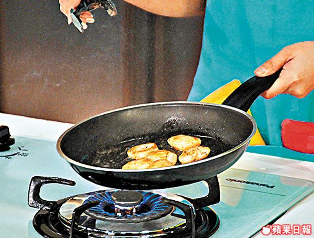 3.燒熱煎Pan,加2茶匙牛油及幾滴橄欖油,煎香帶子及蘆笋後灒玫瑰酒,煮至剛熟上碟。