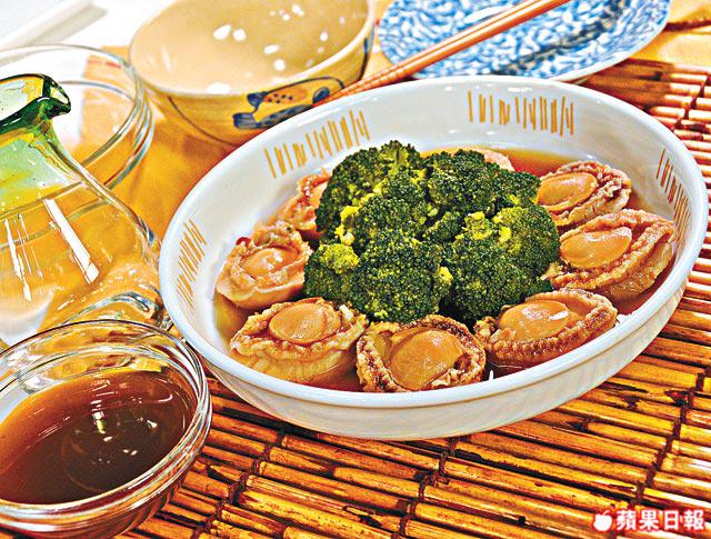 2.鮑魚原罐煲6小時,開罐將鮑魚上碟,留鮑汁。西蘭花以鹽水灼熟。