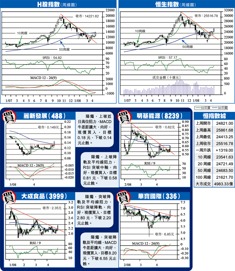 港股上周反覆向好,中央的救市政策令股民重拾信心,A股出現明顯的反彈,加上美股持續反彈,刺激恒指一舉升破多重阻力區,收報25516,全周累積升幅達1319點,加上成交配合,平均每日成交增至996億元,較前周增37%,顯示大市有機會進一步造好。