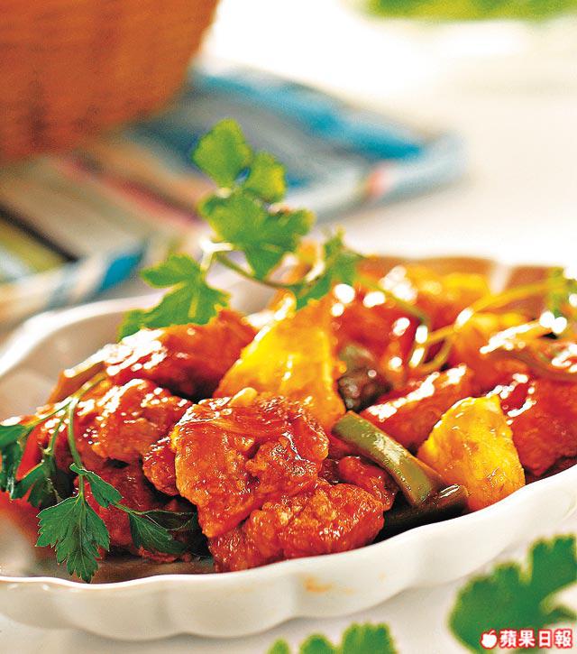 3.燒熱油爆香亁葱頭片,倒入拌好的酸甜汁煮滾,再落腩排及青椒炒勻,加生粉水埋芡,最後落蒜茸及菠蘿粒炒勻便成。