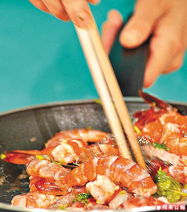 青檸汁不但可以去腥,還可以令各種香料及蝦變得軟身,食落口感更彈牙。去蝦尾時候也要留意,剪去較尖部份,以免弄花鑊。