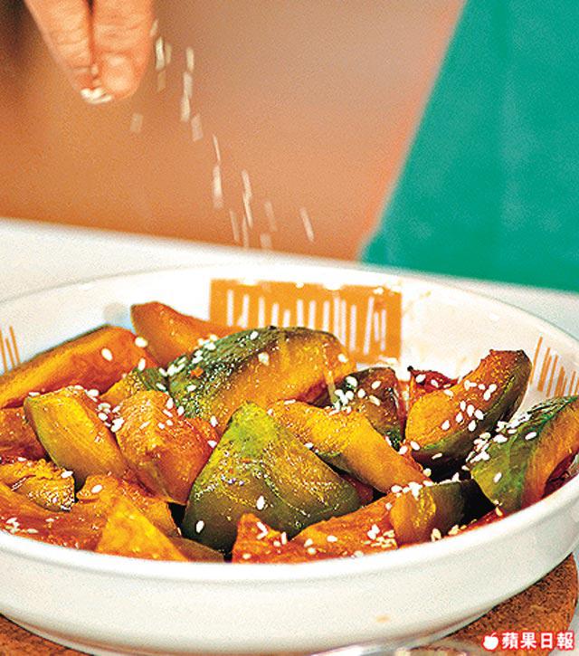 2.拌勻汁料以慢火煮滾離火,加南瓜拌勻,再放入150℃焗爐焗5分鐘便成。