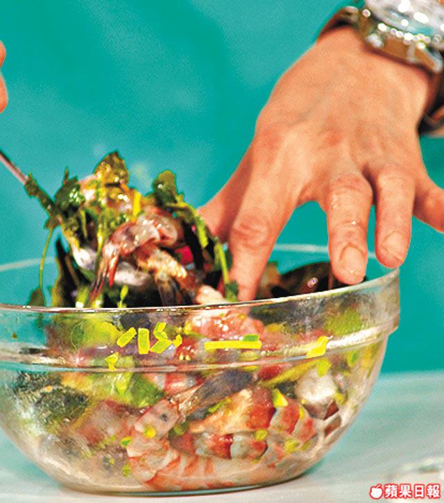 2.大蝦加醃料拌勻醃10分鐘。
