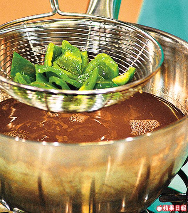 2.燒熱油略炸青椒撈起,再落腩排,以中火炸至金黃色取出。