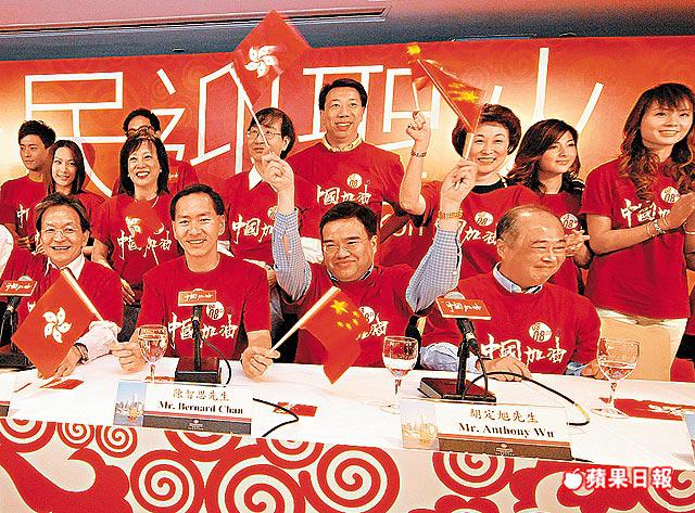 呢個組織來頭唔少,搞手包括貿發局主席蘇澤光、行會成員陳智思、醫管局主席胡定旭、港鐵行政總裁周松崗。佢哋噚日個個着住件紅色Tee出嚟開記者會,件衫上面寫住嘅「中國加油」,更加係由劉華題字。蘇澤光仲話,佢哋一班朋友憑住一顆愛國心,當聖火嚟到香港時,會熱情激動咁歡呼「北京加油」、「中國加油」。