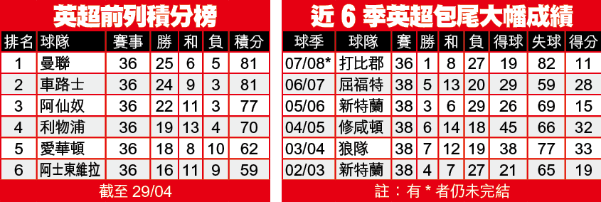 還要留意的是,打比郡於36場聯賽得11分,與新特蘭於05/06球季創下的英超史上最低得分15分,還有4分距離。換言之,要是他們在餘下兩場無法取得4分或以上,便會改寫歷史。此外,他們還有一個紀錄「叫糊」,現時他們於36場聯賽入了19球,如在最後兩場聯賽未能取得兩球或以上,就會打破新特蘭在02/03球季造出的最少入波紀錄(38場入21球)。
