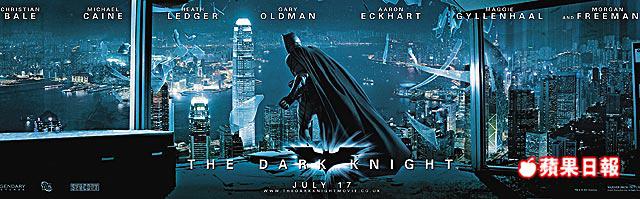 萬眾期待的電影《蝙蝠俠──黑夜之神》,鐵定於7月17日在港上映,比美國提早一天。該片去年於香港取景拍攝,連陳冠希也有份參演一角。這次是蝙蝠俠首度離開葛咸城,為了隆重其事蝙蝠俠空降香港,電影公司特別為《黑夜之神》製作了一張以香港夜景為主題的巨型海報。