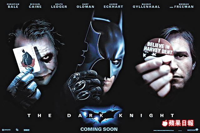 海報可見到蝙蝠俠的背影,他站於半山,俯瞰整個中環、灣仔至尖沙嘴的維港景象,當中可以見到文化中心、香港會展等香港特色建築,極具氣派。海報中還印有主要演員基斯頓比爾(ChristianBale)、米高堅(MichaelCaine)及已故男星希思萊杰(HeathLedger)等七位主要演員的名字,卻沒有陳冠希的名字。該片其他海報還可見蝙蝠俠駕駛型爆新車batpod飛馳的英姿,以及蝙蝠俠、小丑以及鄧夏維(HarveyDent)合併而成的造型海報,極具型格。