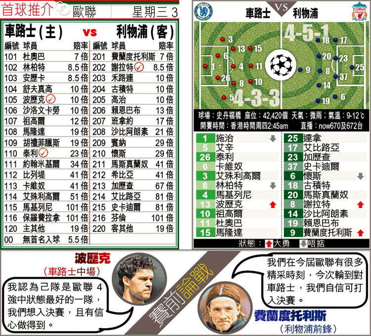 車路士上場在英超大戰曼聯,憑中場波歷克頭頂腳踢贏2:1,現追至與曼聯同分,有望成英超及歐聯雙料冠軍。今仗他們更有中場艾辛「刑滿」復出,配合泰利、波歷克及杜奧巴等主力,陣容完整。