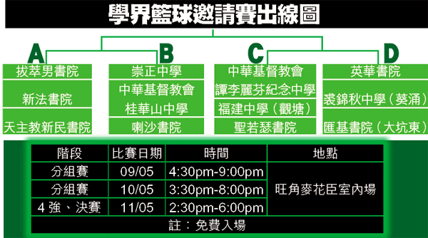 今次賽事雲集多支學界勁旅,當中包括精英賽3甲分子英華、男拔萃及崇正、屯門區9屆AGrade冠軍譚李麗芬等,可觀性比起精英賽不相伯仲;賽制方面,分4組打單循環,每組首名出線4強,上、下半場各10分鐘。以下則為各組別勁旅的簡評: