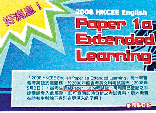 聲明稱,考評局知悉有補習社推出名為「2008HKCEEEnglishPaper1aExtendedLearning」的服務,聲稱可於5月2日會考英文科當日,考生完成卷1A閱讀理解後,透過手機短訊獲得該卷的「即時分析」,又指這些資料「有助考生對卷1B(即作文)有更深入了解」。當日考生應考兩卷之間,共有45分鐘休息時間。