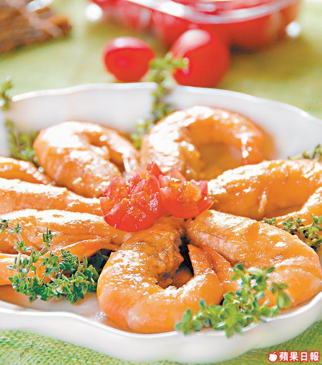 3.開中火下海蝦,再下汁料煮至收亁水份後熄火上碟。