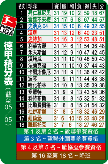 簡評:隨着拜仁慕尼黑正式封王,將於下季重返歐聯舞台;而雲達不來梅及史浩克04稍為拋離漢堡及史特加,相信歐聯餘下兩席不出這4支球隊。歐協盃方面,多蒙特憑德國盃亞軍身份已奪一席,漢堡、史特加雖進佔4、5位,但能否取得餘下兩個歐協盃席位,要力拒利華古遜及禾夫斯堡的後上。降班形勢方面,歇冬前被視為「降班膽」的科特布斯下半季接連搶分,與比勒費爾德以3分暫脫離降班區域,杜斯伊堡、紐倫堡及羅斯托克卻絕不樂觀。