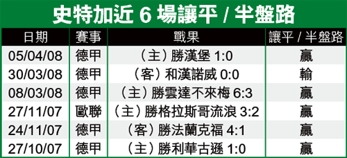 有一點值得留意的是,史特加今屆讓平/半的盤路不俗,近6次讓平/半,敲上盤就有5次得手(見附表),今役史特加又讓平/半,不難再次開出上盤。