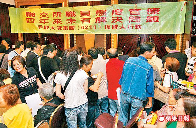04年4月開始停牌嘅大凌集團(211),復牌之日遙遙無期。聲稱完全冇公司大股東張志誠家族泵水贊助嘅「大凌小股東權益關注組」,早排喺多份報章發公開信,噚日終於成功「號召」超過200名小股東,拉晒橫額標語,操去中環港交所(388)總部國金一期請願,要求復牌。