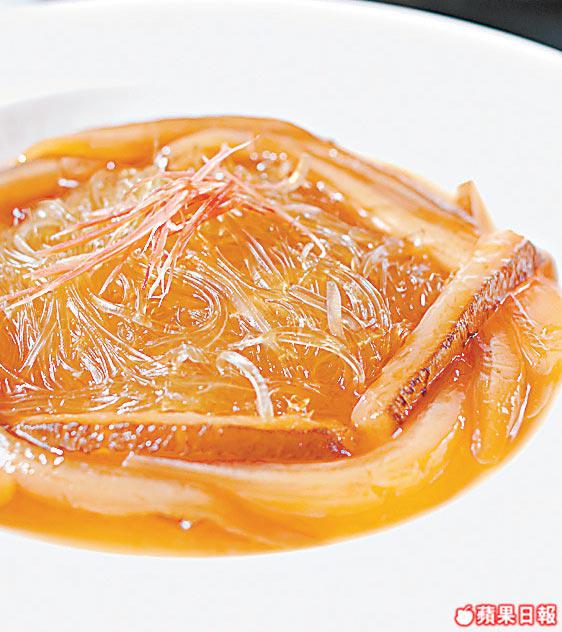 選用日本八頭網鮑,每隻鮑魚超過3吋長,師傅以新鮮蠔水燜至入味,口感煙韌細膩。